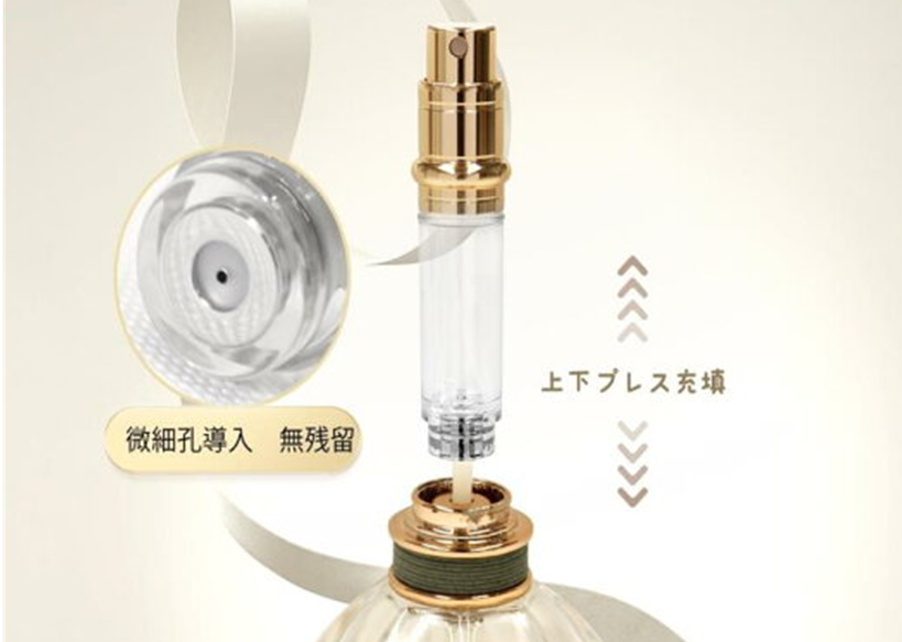 香水瓶のノズルとアトマイザーを密閉させて直接注入する方式のため、ボトルのサイズや形状を問いません。
