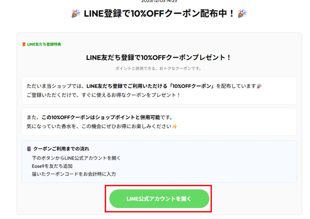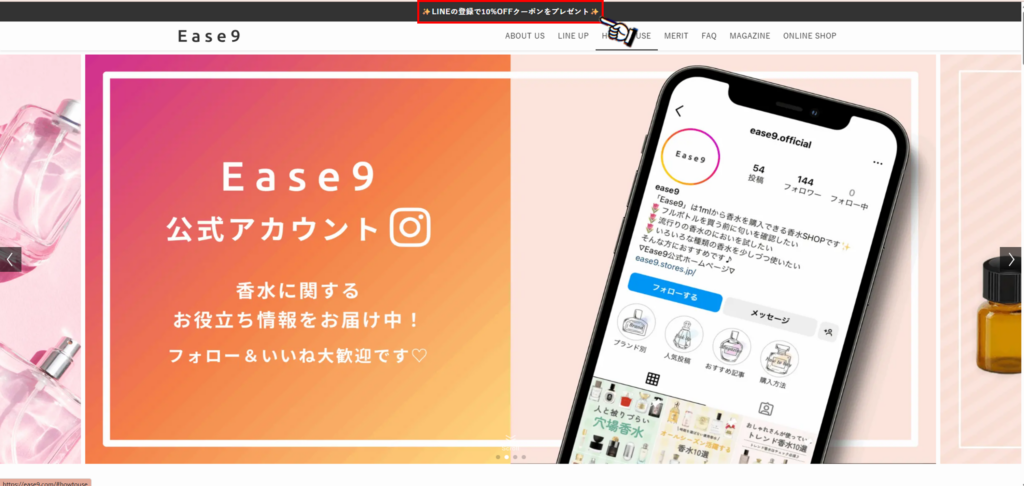 Ease9はLINE追加するだけで10%クーポンを獲得することができます。